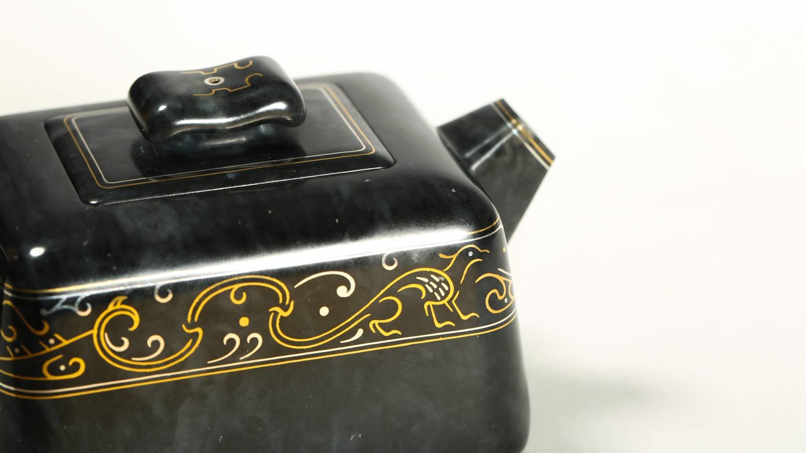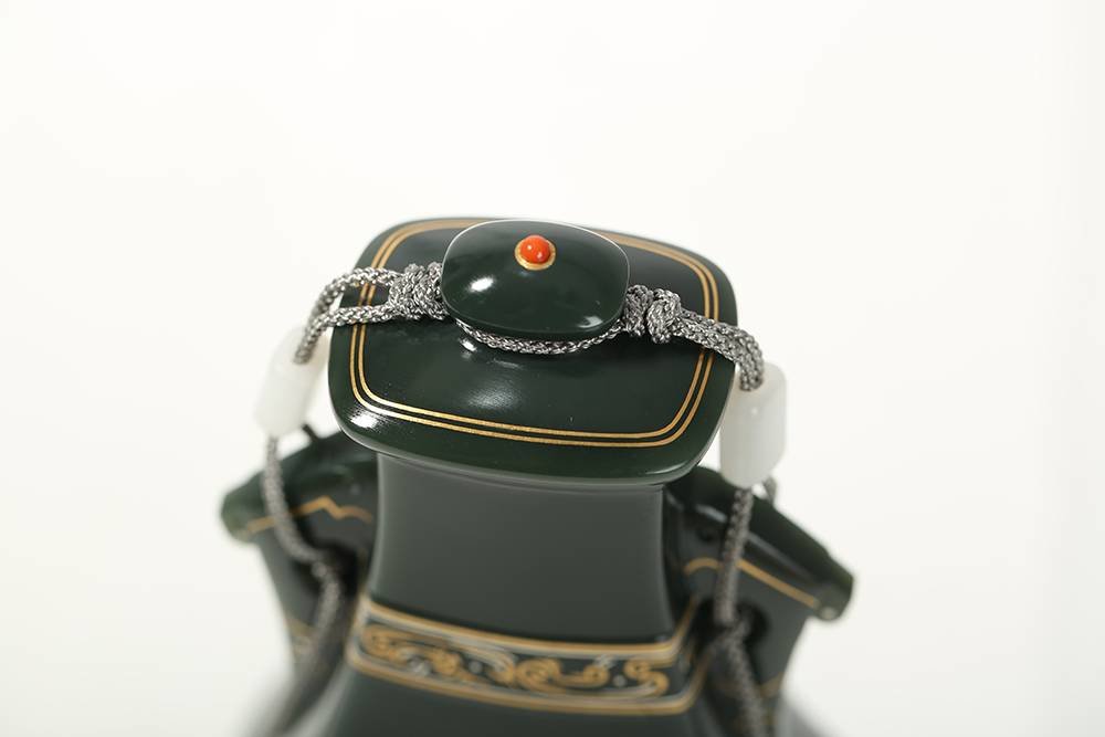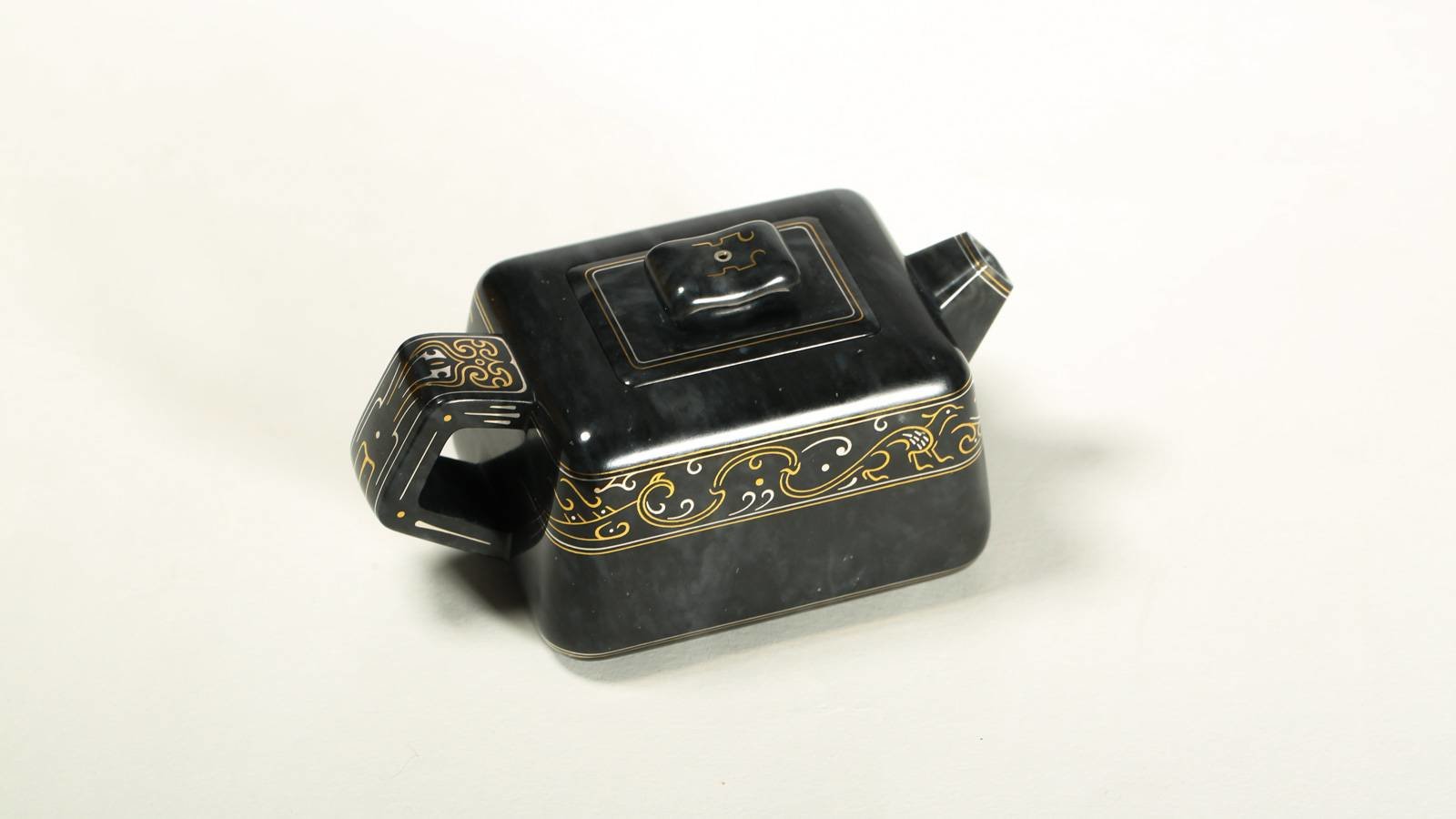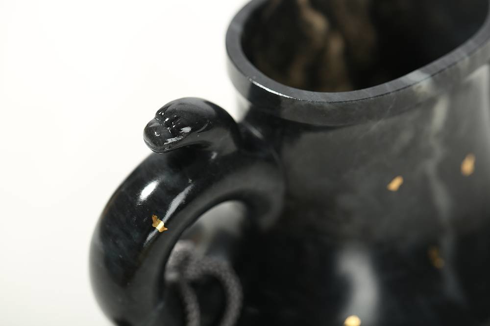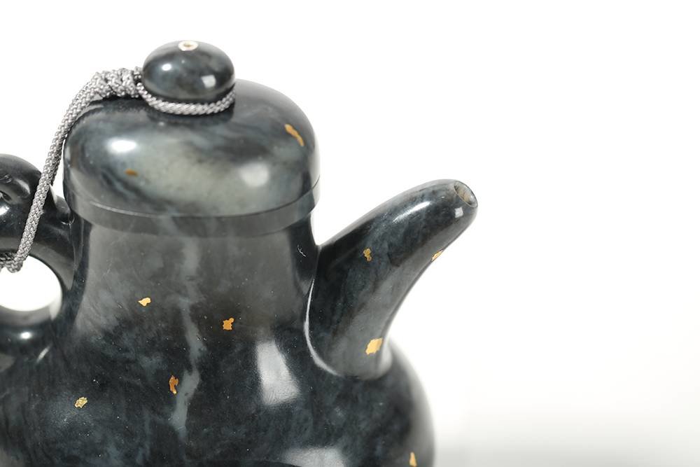 器不藏拙,匠心独运,作品《鸟兽云纹壶》选上乘新疆和田青花籽料所做,玉质细腻缜糯,玉色分布,仿若水墨晕染,作者巧思,于壶身处错金银云纹,与泼散的墨色相得益彰,壶把处错金鸟兽纹,老味十足。