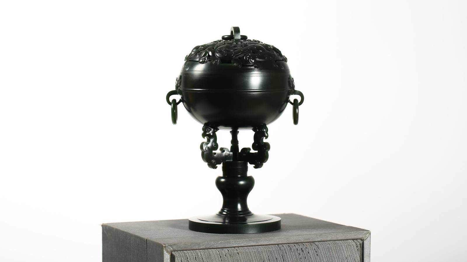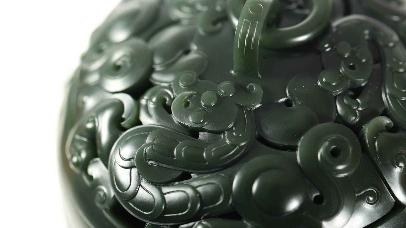 古韵今风,气韵轩昂,作品《盘龙纹香薰》,以优质青海青玉为材,器型仿古,亦有作者新意置于其中,炉盖处堆叠盘龙纹,重工巧琢,以呈细腻的层次感,炉身规整,淌线凝练,炉盖与炉身严丝合缝,浑然一体,底足巧琢,灵性且古味十足。