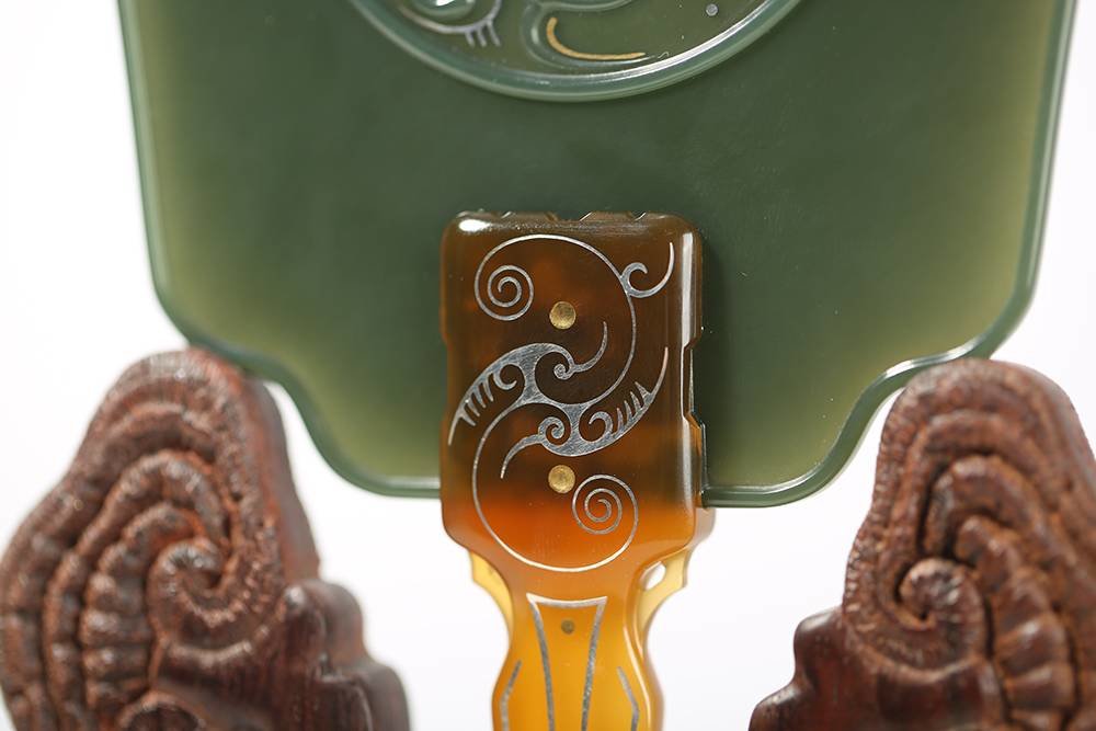 玉作谋新,突破传统玉雕的美学界限,作品《云纹扇》,是错金玉雕中难得一见的薄胎作品,选优质青海青玉为材,玉质润糯,玉色典雅,薄胎扇面错金银云纹,灵动的线条,呈现云的动态感,与扇的作用相得益彰,搭配古拙十足的底座,经典而大气。