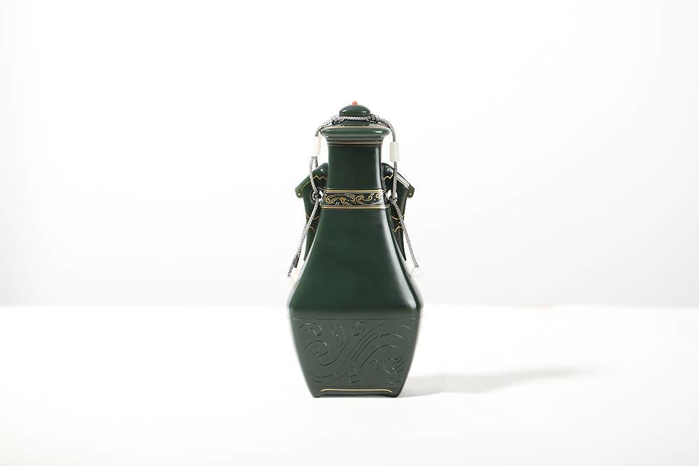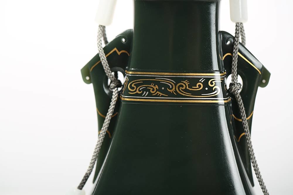 玉意隽永,工意俱佳,作品《高升瓶》以优质青海青玉为材,玉质油润,玉色静雅,器型规整对称,底部阴刻水纹,颈部错金工艺打造云纹,双耳巧琢游鱼,有鱼跃龙门、步步高升之美意,整器古拙敦厚,新意满满。