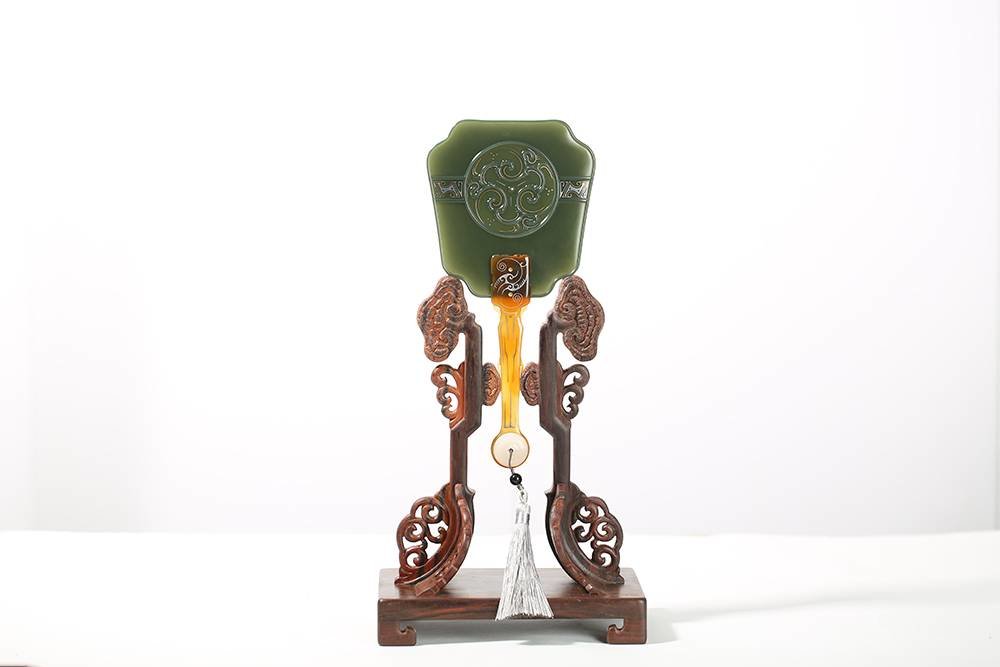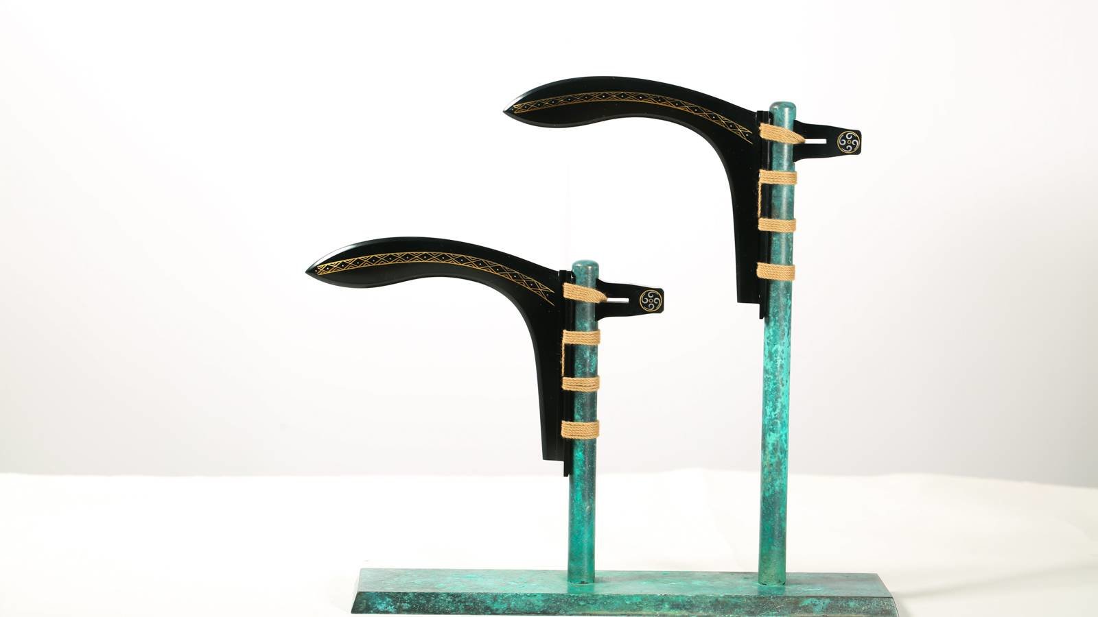 金戈玉作,跨越时光的长河,作品《玉戈》,选上乘新疆塔青料所琢,两枚玉戈巧妙地竖立于氧化青铜色底座上,相得益彰,玉戈线条流畅,弧面圆融大气,作者错金银点缀玉刃之上,极具观赏性。