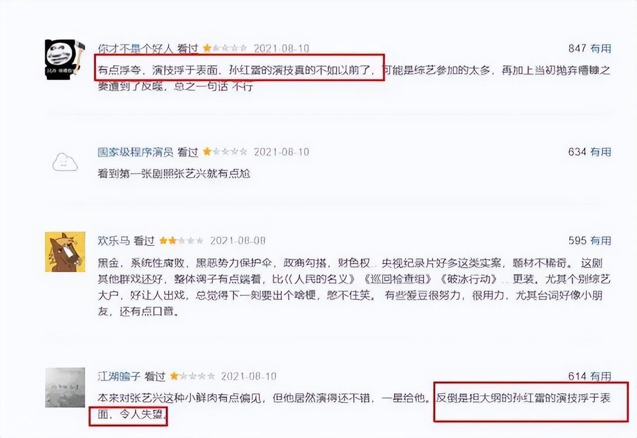 而观众的评价也认为“孙红雷演技浮夸”“浮于表面,令人失望”。