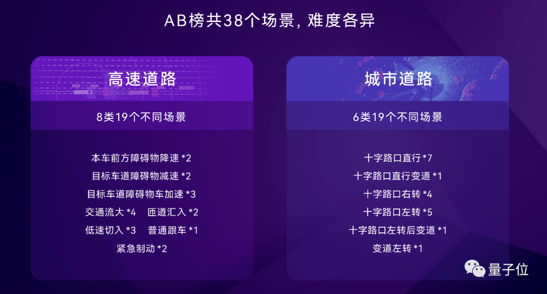 AB两榜共38个场景,难度各异,综合高速和城市道路场景。