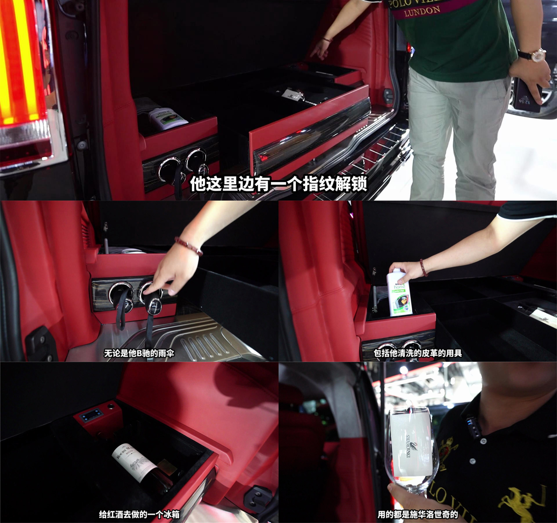 好戏还在后头呢。奔驰V260L冰岛红款特别设计后备箱指纹密码电动抽屉,红酒、西装、衬衫、领带等各种装备,都能放在这里。左边雨伞收纳筒,自动折叠雨伞,顶部的衣架还能挂起礼服裙等,很有仪式感。