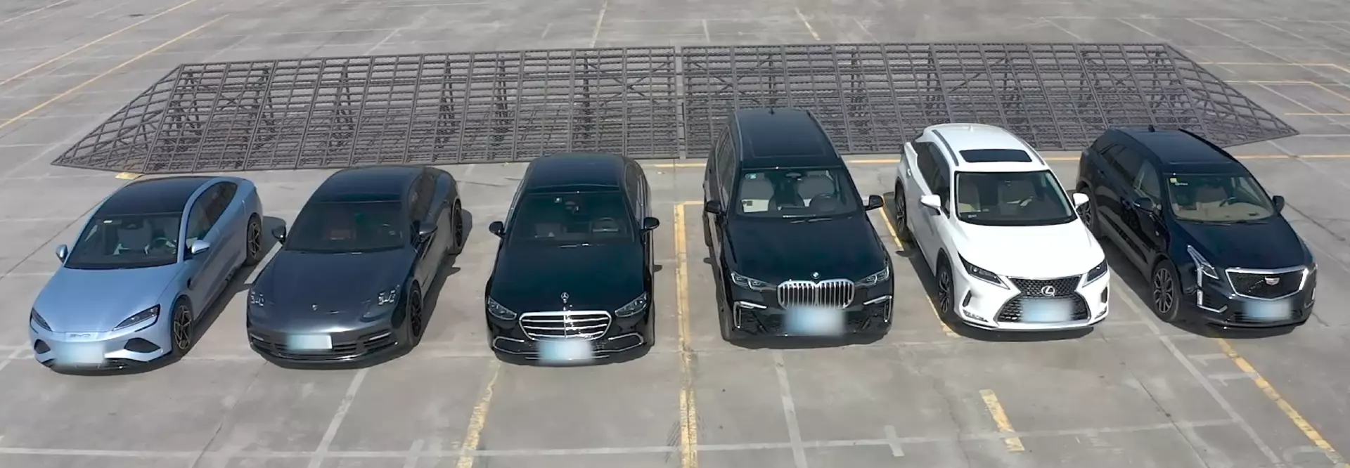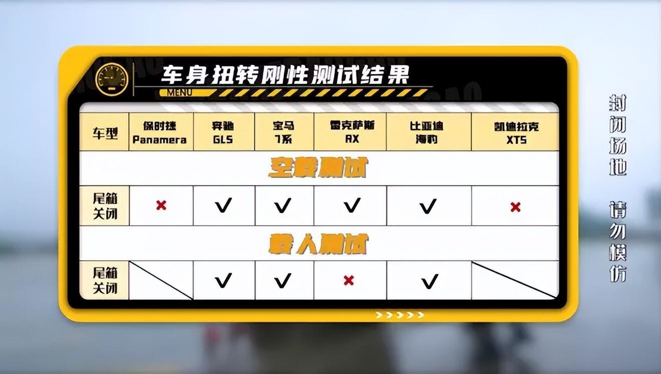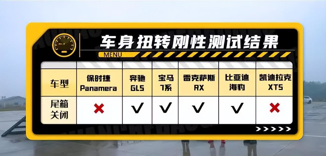 这次的横测分为两轮,测试方式也就是上述提到的将一侧车轮离地,然后开关尾箱门。第一轮空载的情况下,2个豪车品牌“阵亡”,分别是凯迪拉克XT5、保时捷Panamera,而雷克萨斯RX、宝马7系、奔驰GL5以及比亚迪海豹都顺利通过了测试。