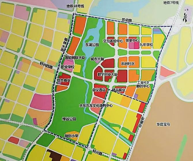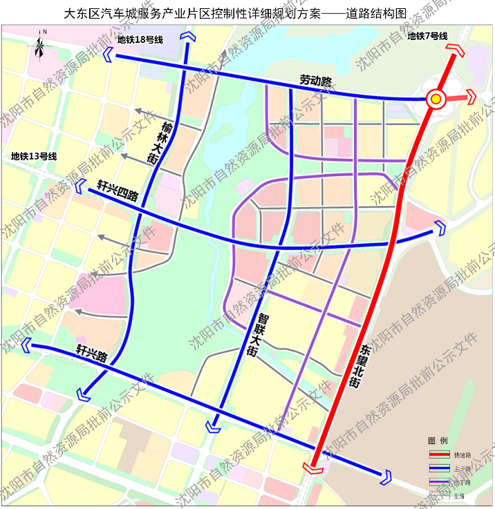 交通方面,大东区汽车城服务产业片区规划新增东望北街快速路并控制立交节点,实现5分钟进入全市高快速路系统;内部规划“三横三纵”路网骨架,构建“窄马路、密路网、微循环”道路网体系;远期规划的地铁7号线、13号线、18号线将形成“两纵一横”轨道线路,区域内设置车站4座,站点800米半径覆盖率达80%。