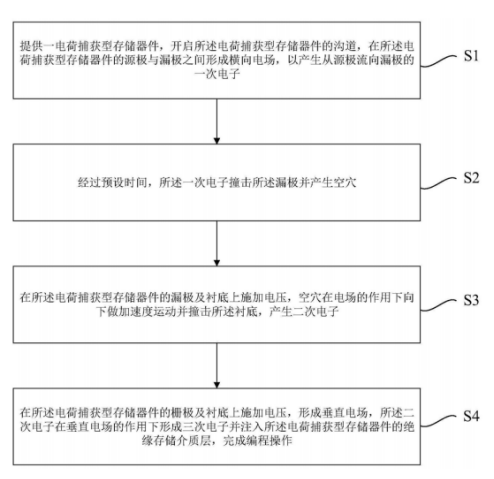 图1为电荷捕获型快闪存储器的编程方法流程示意图,首先需要提供一种电荷捕获型存储器件,并开启其沟道。图2为形成横向电场的操作示意图,电荷捕获型存储器件为SONOS器件,于SONOS器件的栅极、源极和漏极分别施加电压,以开启SONOS器件的沟道,在器件的源极与漏极之间形成横向电场,以产生从源极流向漏极的一次电子(S1)。