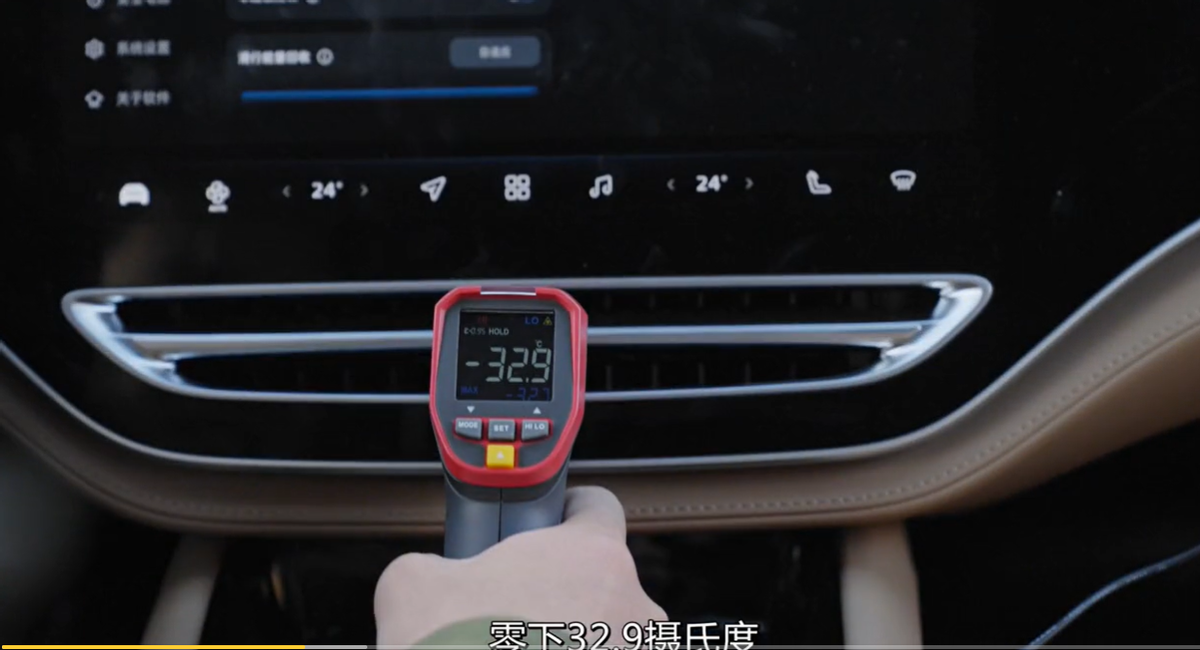 既然是冬季测试,空调能否制热,是新能源汽车面临的最大挑战之一,在零下十几度或是二十几度的天气,有的车不仅不能制热反而在制冷。首当其冲是飞凡R7,空调没开始的时候,车里温度还有个1.7度,空调开着的时候,车里的温度直接来到零下32度多。
