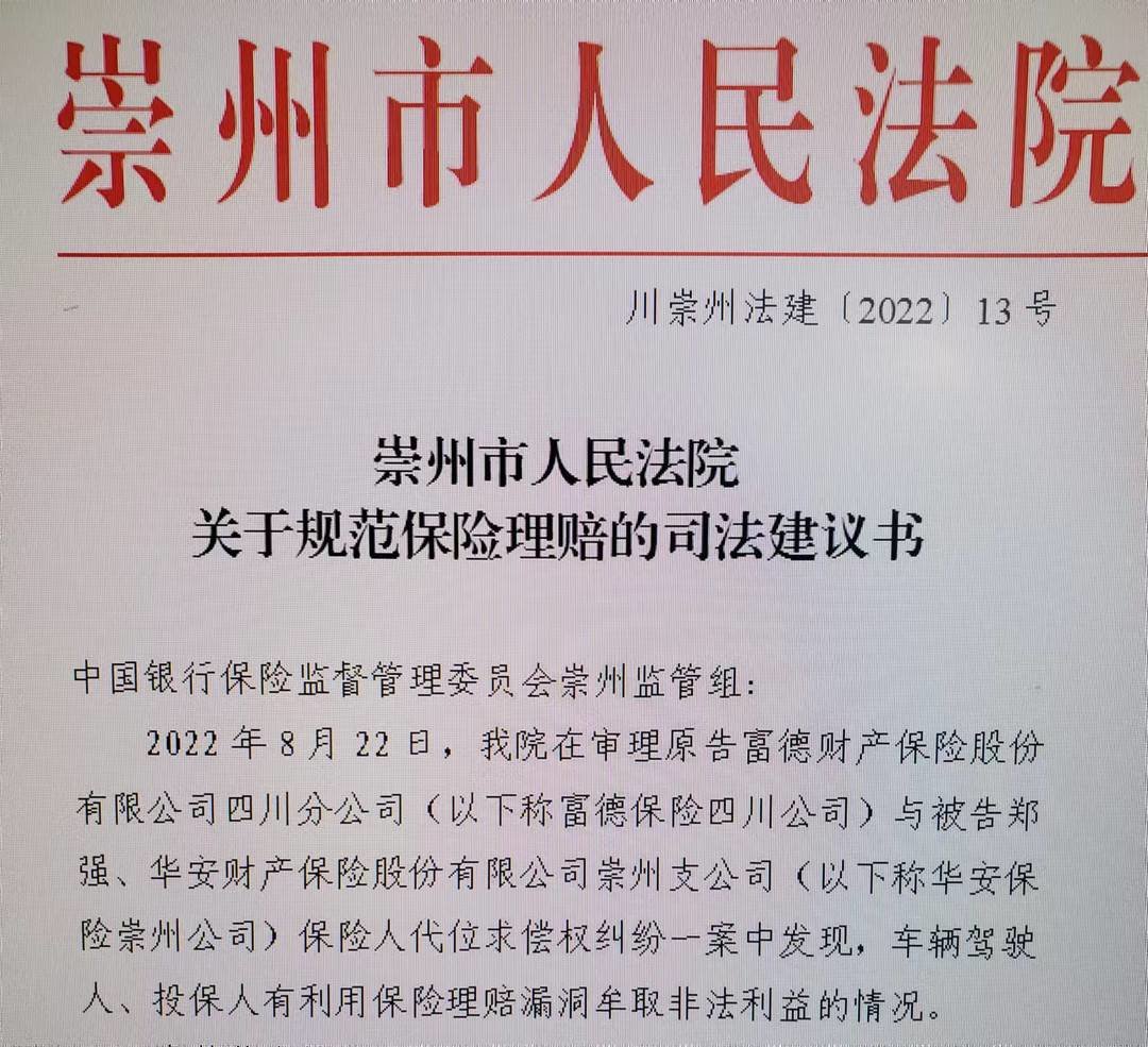 银保监会崇州监管组及时回复崇州法院,完全同意法院司法建议,表示将在近期对辖区内各保险机构开展监管约谈,通报保险理赔案件相关情况,并提出规范理赔流程的监管意见;同时,督促辖区内各保险机构加强内控制度建设,规范保险理赔流程,及时搜集相关证据材料,避免重复赔偿对保险公司造成损失。