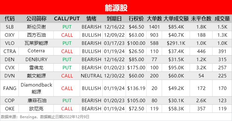 上周美俄“原油大战”背景下,油价盘中波动大,上周五多只能源股出现期权异动。雪佛龙 $CVX 出现2023年1月20日到期、行权价为175美元的看跌期权大单。近期,雪佛龙披露了在石油需求和价格高企的情况下明年增加能源项目支出的计划。