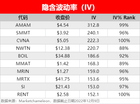 上文提及的医药股Ambrx $AMAM 隐含波动率极速升高,达312.8,位居榜首。2倍做多天然气ETF $BOIL 隐含波动率继续居高位,达到186.6。
