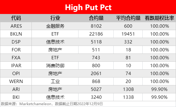 当日Put单比率达到100%的个股或ETF有8只,房地产板块阿波罗商业房地产 $ARI 、福里斯特 $FOR 等均遭看衰。