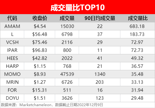 上周五(12月9日),医药股Ambrx $AMAM 飙升1007.59%,期权成交总量骤升至15030,相对成交量比达683.18。该股于当日盘中不断触发临时停牌,该公司针对乳腺癌抗体偶联(ADC)疗法ARX788发布了ACE-Breast-03中级阶段研究的初步数据,结果表明,该疗法确认了整体57.1%的反应率(受试样本为7名病患)。