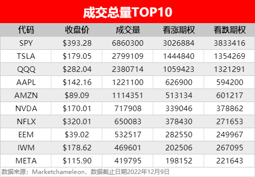 奈飞 $NFLX 期权成交总量新上榜Top 10,该公司联席行政总裁Ted Sarandos表示,公司在经历今年艰难的一年后,明年收入将会反弹。富国银行上调该股评级至“增持”,目标价由300美元上调至400美元。科文分析师John Blackledge将奈飞目标价从340美元上调至405美元,并维持对该股“跑赢大市”评级,并将该股列为其2023年大盘股首选。