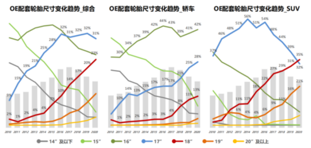 数据表明,10年间,轮胎市场上17寸-19寸的轮胎销量猛涨,而13-16寸的轮胎销量下滑。