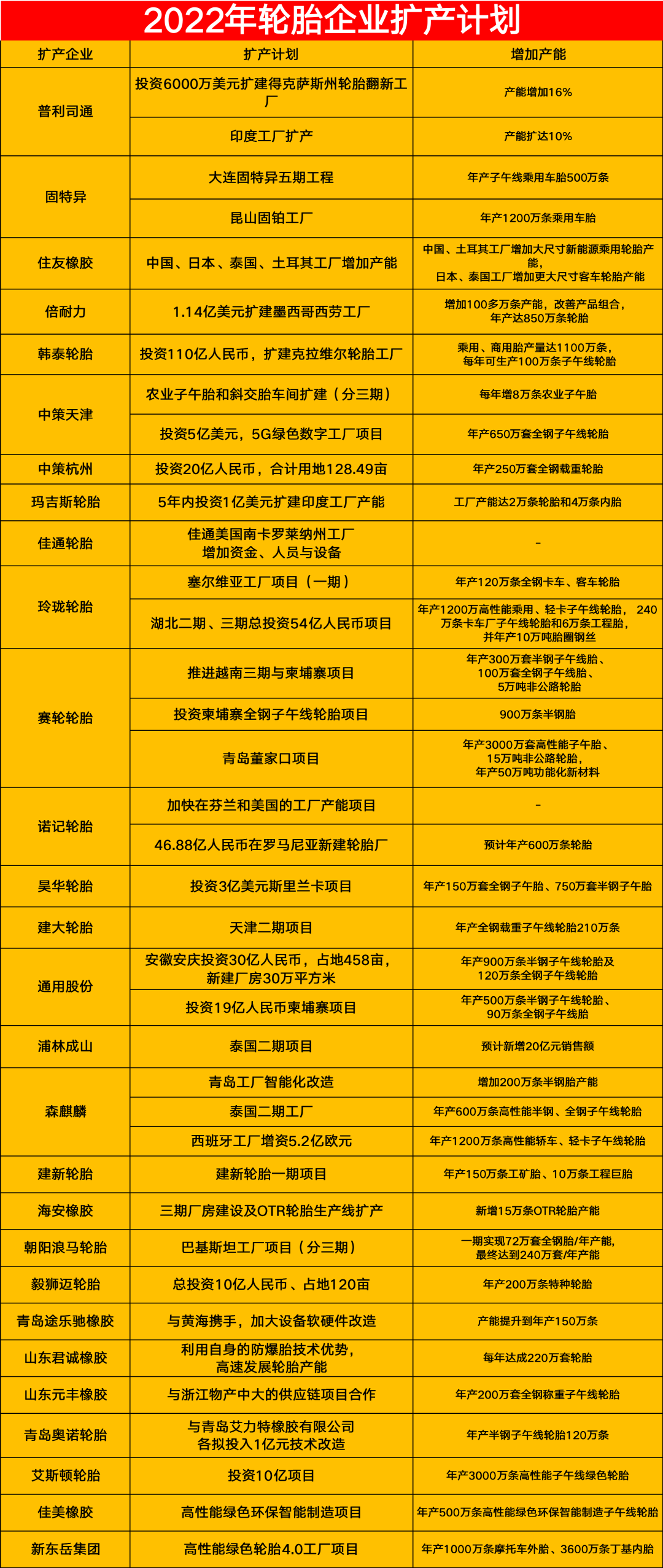 在大批轮胎企业清退下,头部企业逆流而上,在全球大力扩产,抢占市场,这里小邦统计了2022年内宣布扩产的轮胎企业如下: