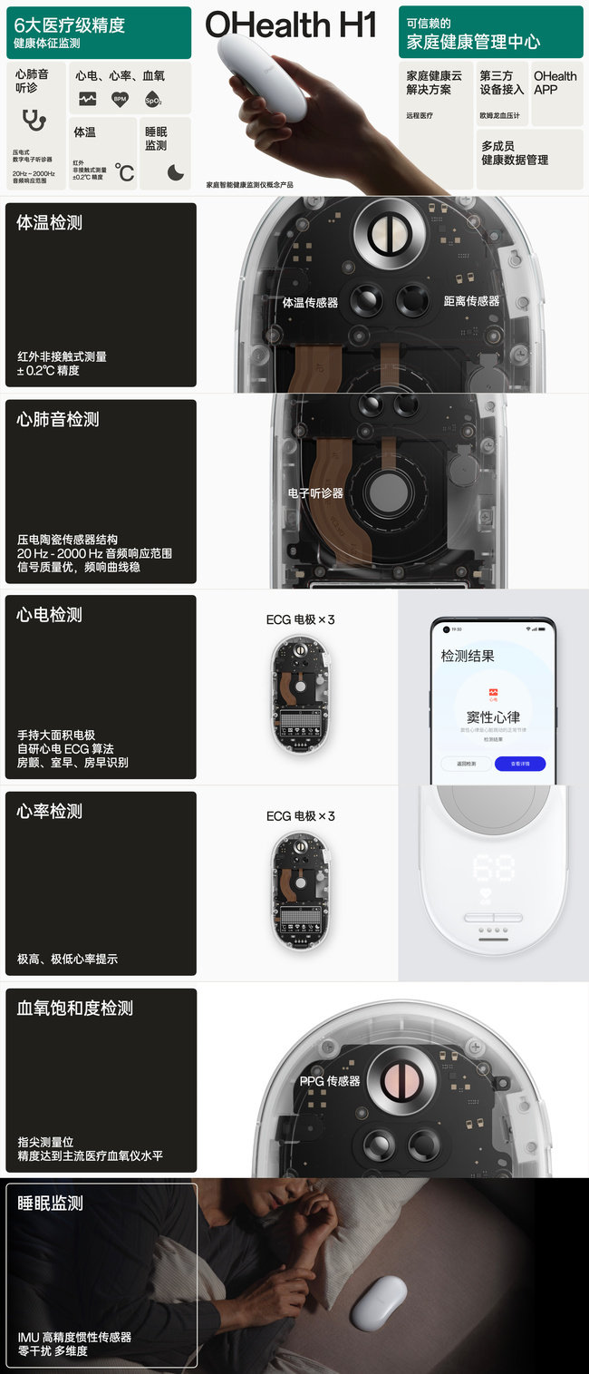 据了解,OPPO OHealth H1采用了温暖弧线设计,形态简约圆润,尺寸与小号鼠标相当,产品的背面,采用了磁吸式充电,在充电底座上时可以融入成为一款“居家小物件”。OHealth H1背面则集成了诸多传感器,由心电传感器)、体温传感器、ToF传感器等组成;中部则配有心肺音传感器、心电传感器、心电传感器、显示屏以及马达;底部为左右按键、喇叭以及充电引脚,从而进行多体征数据测量。