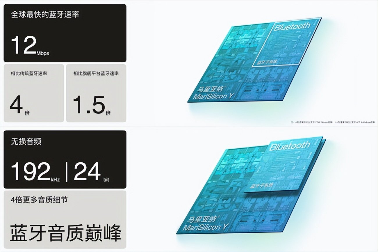 全新的第二颗自研芯片马里亚纳MariSilicon Y为一颗旗舰级蓝牙音频SoC,采用了超高速蓝牙解决方案,可以达到目前行业最快的12Mbps蓝牙速率,并且通过定制研发性能领先的URLC无损编解码技术,首次实现了蓝牙192kHz/24bit 无损音频的无线传输。