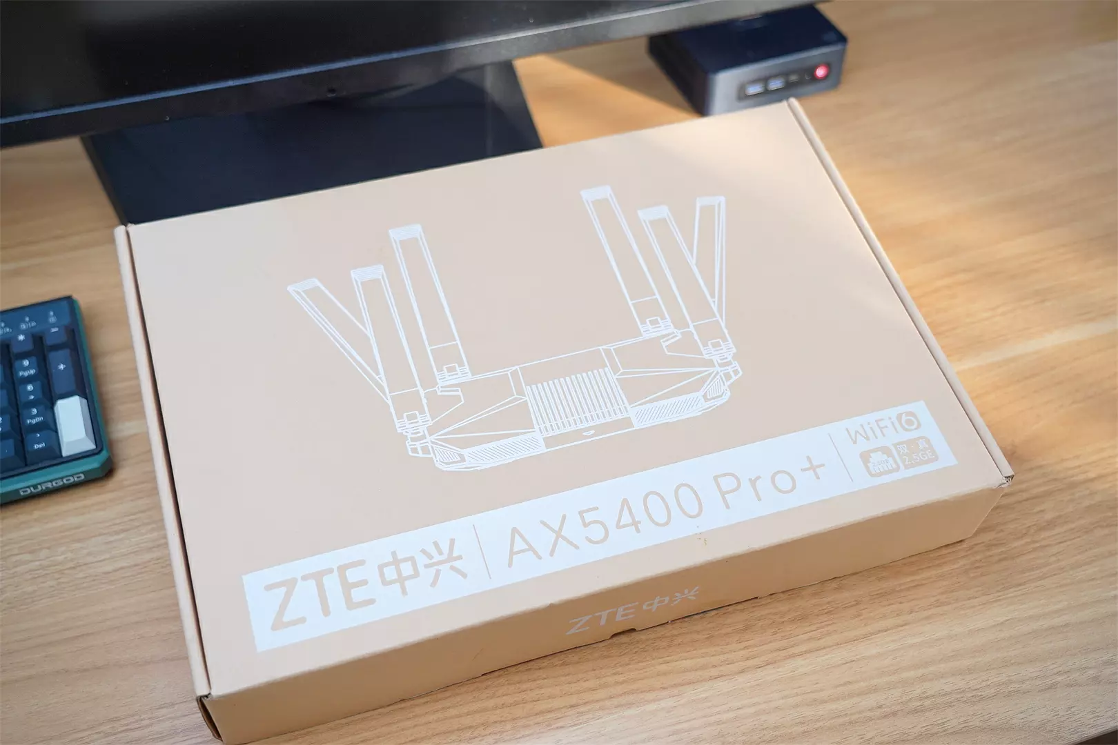 中兴AX5400 Pro+的包装还是依旧采用简约的设计风格,正面是这款路由器的全景图,当然是简笔画。底部是这款路由器的全称--中兴AX5400 Pro+,当然最重要的还是右下角的WiFi6与双・真2.5GE标识,目前WiFi6已经成为路由器的标配。