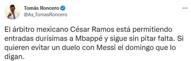 赛后,《阿斯报》主编龙赛罗为姆巴佩此役的遭遇鸣不平。他怒斥当值墨西哥主裁塞萨尔-拉莫斯:“你怎么允许摩洛哥球员对姆巴佩进行各种凶狠的对抗,而且始终不吹犯规。如果他们想避免姆巴佩在周日与梅西进行正面对决,就让他们这么干去吧。”
