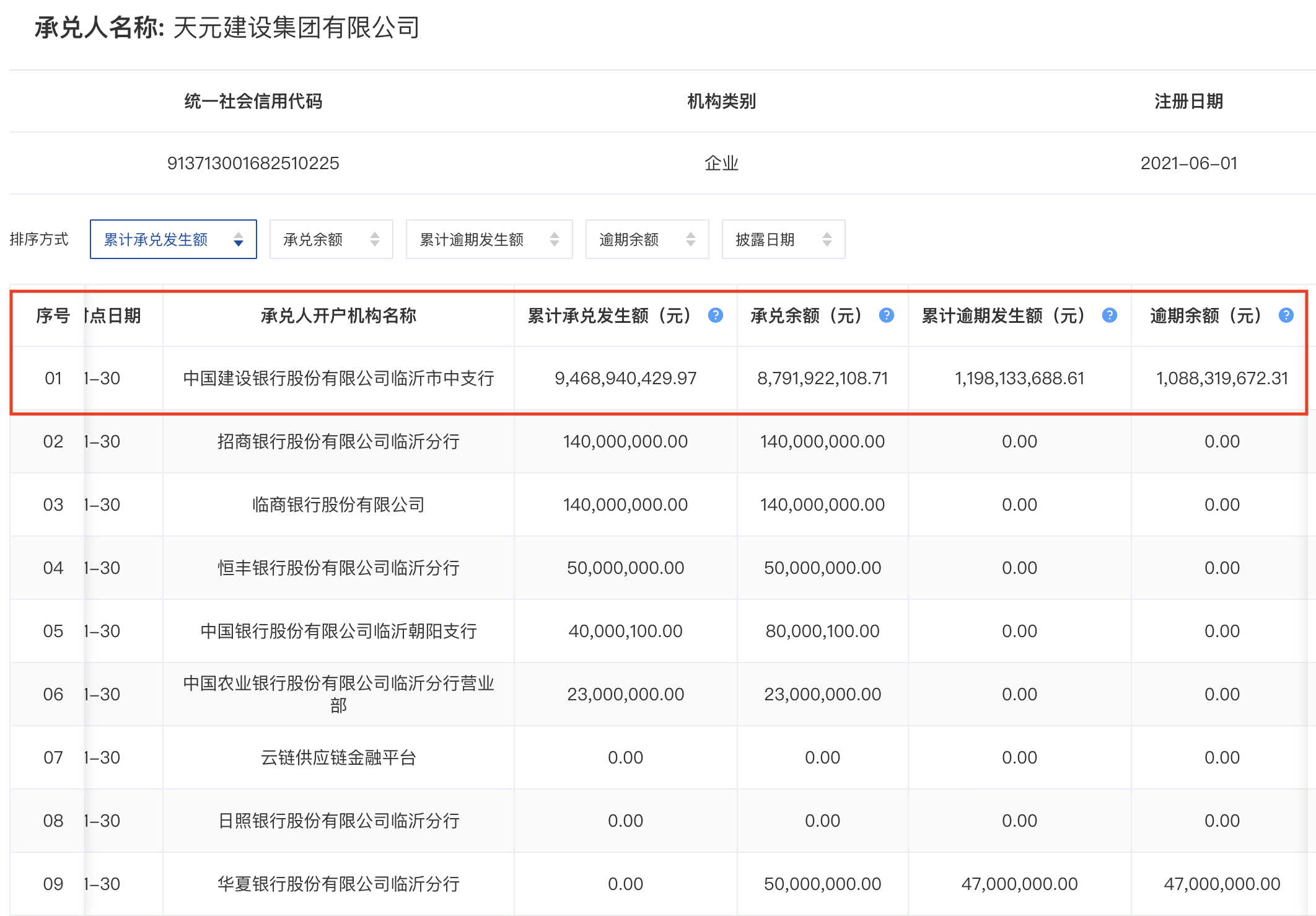 上海票交所信息显示,天元集团仅在中国建设银行股份有限公司临沂市中支行一家开户机构的商票逾期余额就高达10.88亿元,其在华夏银行股份有限公司临沂分行的商票逾期余额为4700万元。
