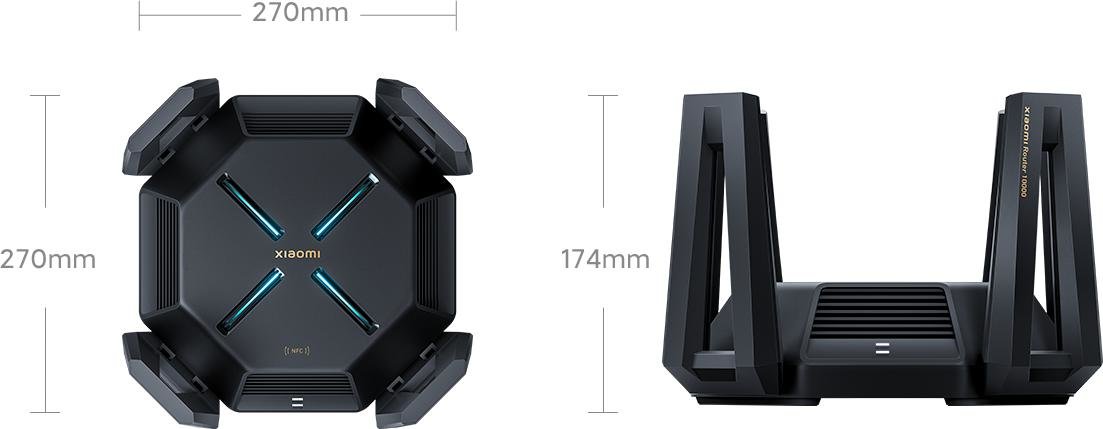 小米万兆路由器整体外观为黑色,机器顶部设计有X形氛围灯,支持自定义灯效,用户可在米家APP中设置;中心印有金色“Xiaomi”Logo。路由器尺寸为270x270x174mm(天线展开状态下),重2.15Kg,电源适配器为12V/5A规格。