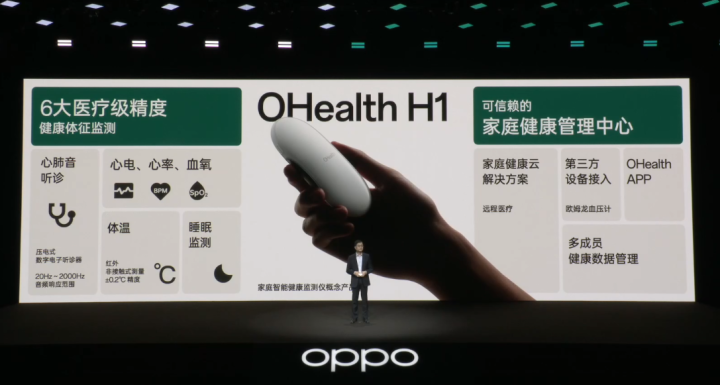 OPPO首款面向家庭用户的智能健康概念产品——OHealth H1家庭智能健康监测仪基于OPPO自研技术,实现医疗级精度的体温、心电、心率、血氧、心肺音听诊、睡眠六大生命健康体征数据整合监测。并在安第斯智能云的赋能下,通过OHealth APP实现健康数据综合管理、AI辅助诊疗和远程医疗。