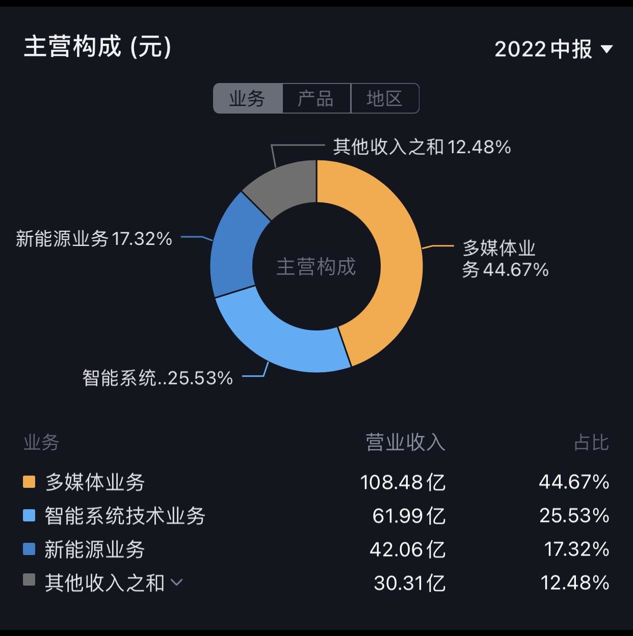 智能电视系统产品中,中国大陆市场的营业额为69.80亿元,较去年同期下降21.8%;海外市场上,智能电视系统产品的营业额为61.37亿元,较去年同期下降15.7%。