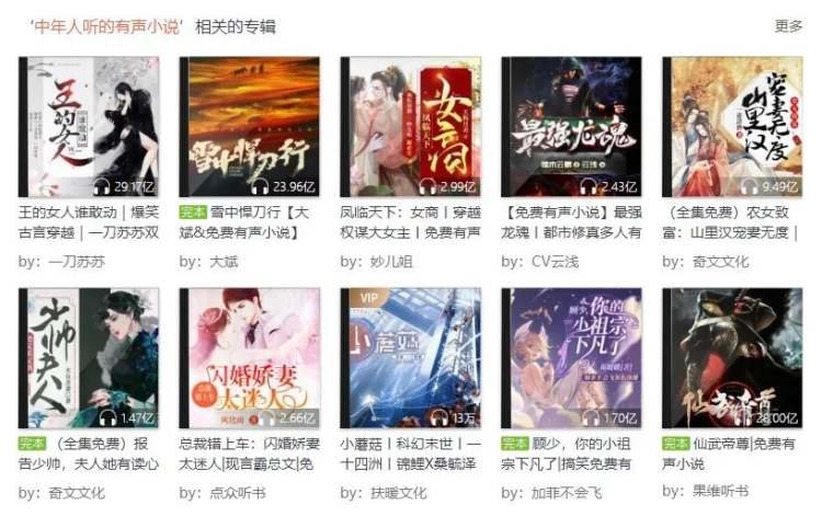 在喜马拉雅“中年人听的有声小说”推荐栏里,《报告少帅,夫人她有读心术》《王的女人谁敢动》《总裁错上车之闪婚娇妻太迷人》等名字赫然在榜,最高播放量达29亿次,爹妈们已经把霸总小说看出了一片红海。
