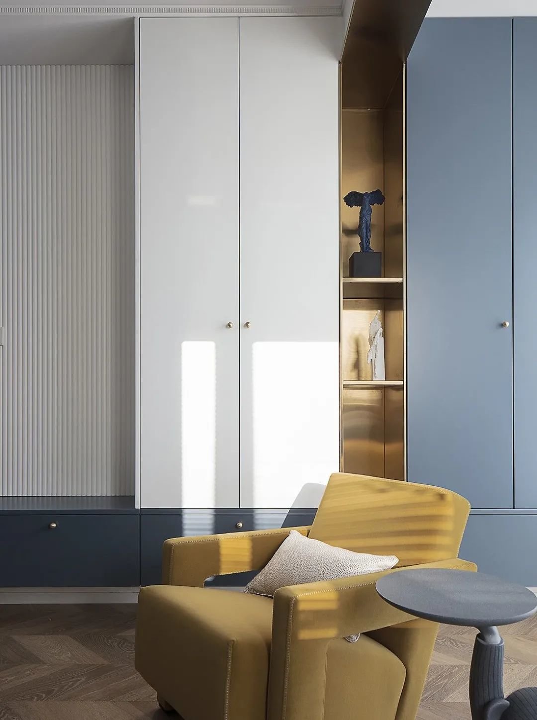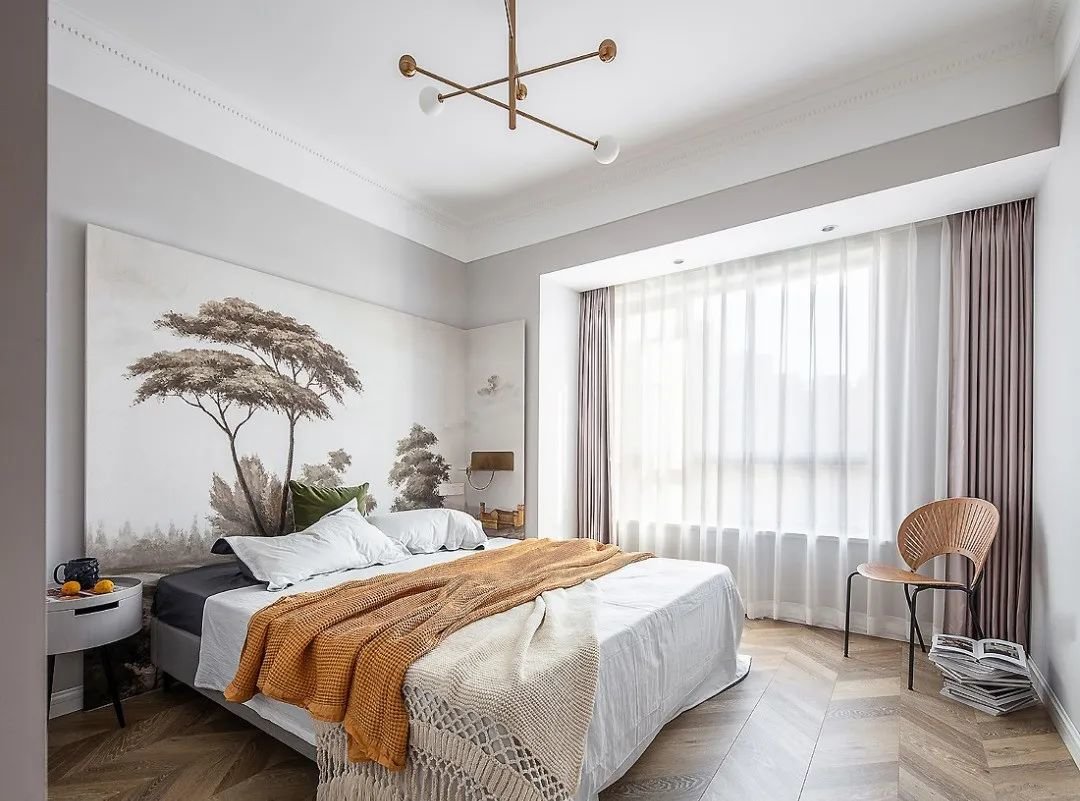 主卧的色彩更加轻松明快,大面积的浅灰色墙面和鱼骨拼地板,更加富有质感。