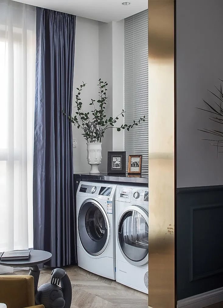 阳台被改造成一个洗衣区+晾晒区,与电视柜一体设计的储物柜解决这里的收纳问题。