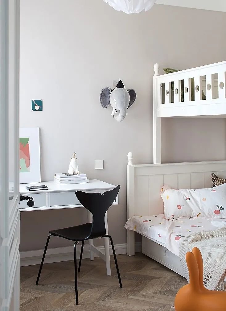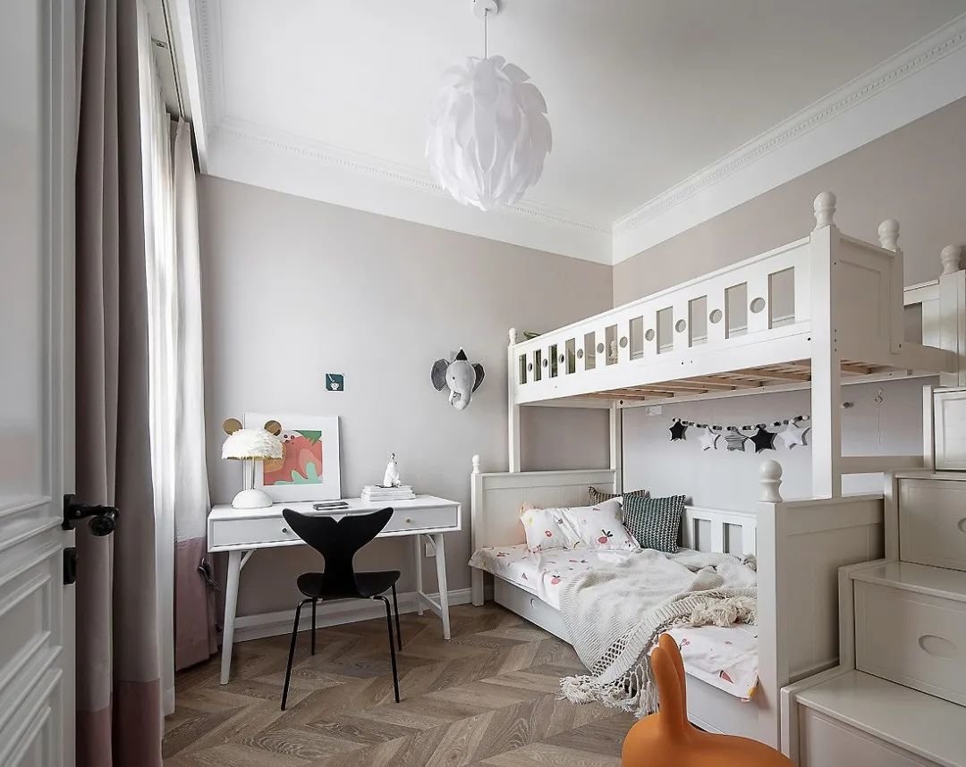 儿童房通过上下儿童床来实现两个孩子的居住功能,抽屉式的楼梯可以解决一些收纳问题,书桌作为孩子们日常学习的地方,旁边还留出玩耍区域。