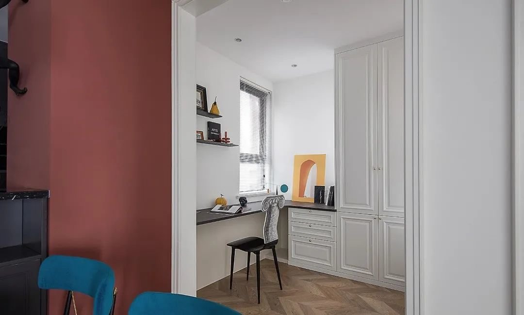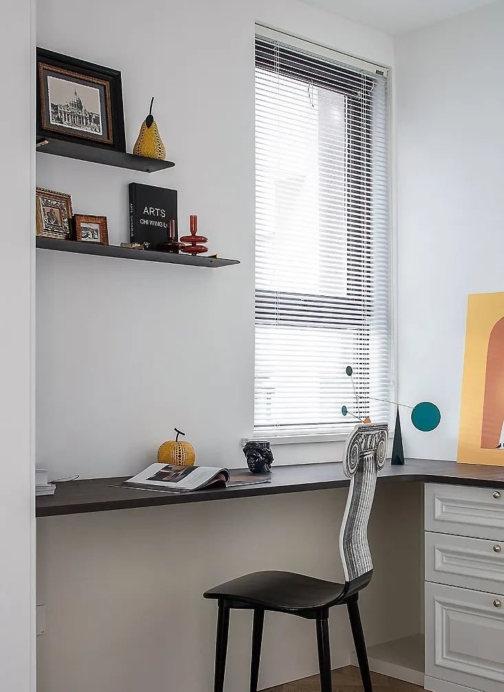 餐厅旁边还有一个开放式的书房设计,白色百叶帘透光不透影,展现出一种低调的高级感。书柜做到与墙顶高,藏书和收纳空间最大化。