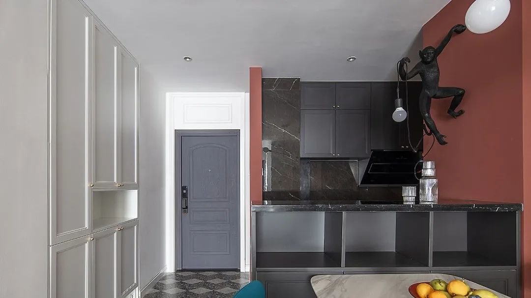 厨房,红色墙面搭配黑色哑光橱柜,空间视觉冲击力很强。右侧吧台也能作为一个备餐区使用,地面采用深色水磨石地砖,大面积的深色调更体现质感。