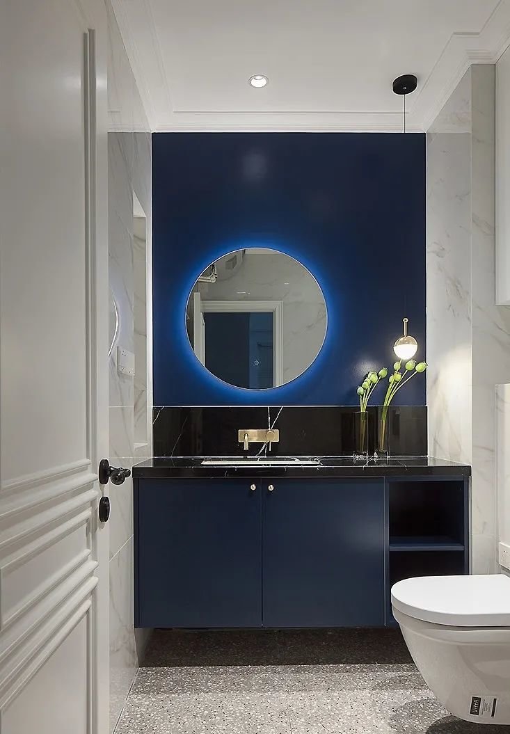 卫生间墙面采用白色大理石通铺,和浅灰色水磨石地砖很搭。深蓝色浴室柜旁边设计了开放格,浴巾和换洗衣物都很方便取用。