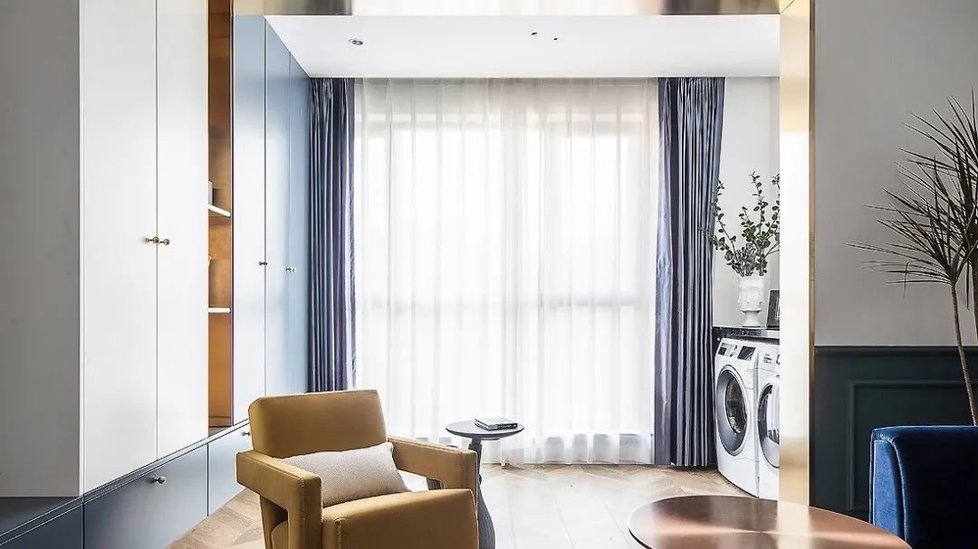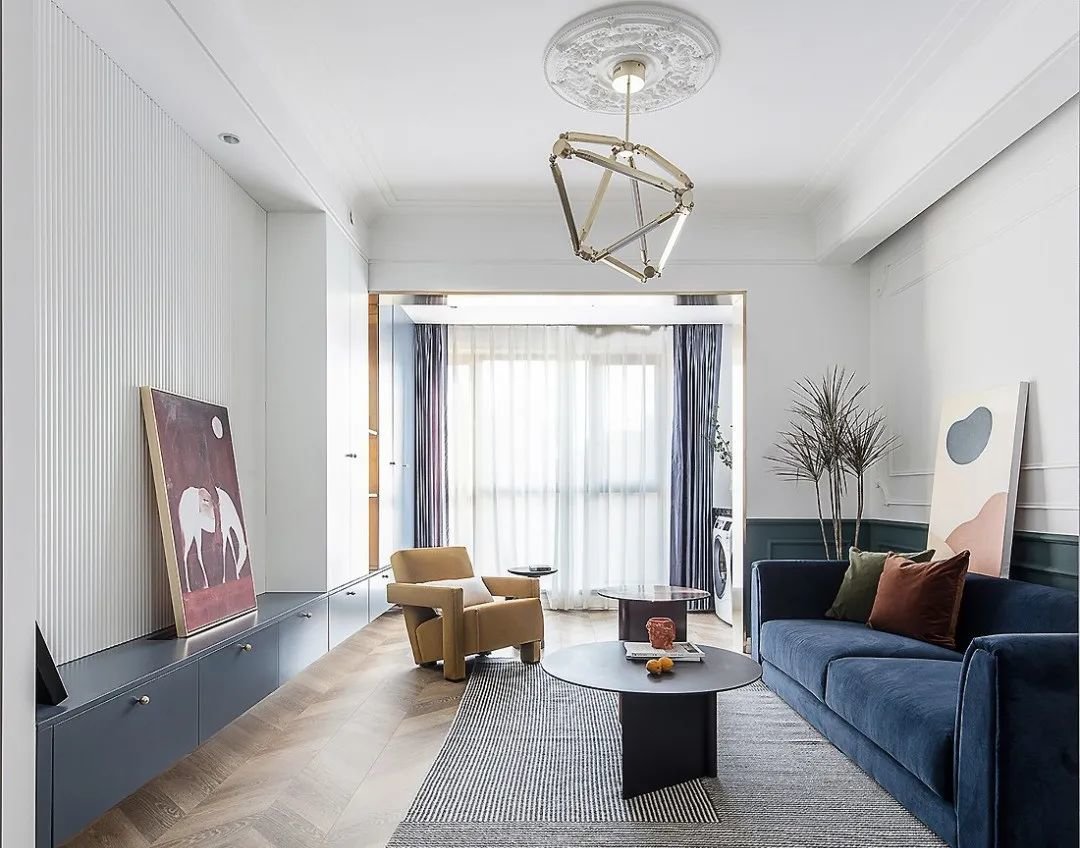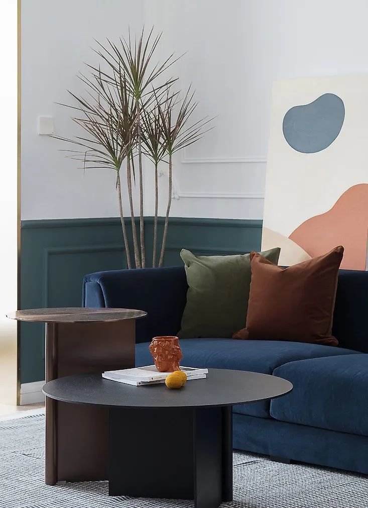 深蓝色丝绒沙发和姜黄色单人沙发椅,配合边几、地毯打造舒适的空间氛围。没有太多的家具,沙发和挂画丰富的颜色和材质,具有不俗的美感表达。