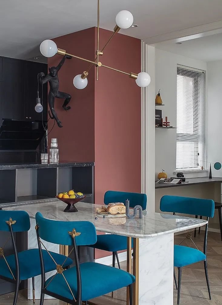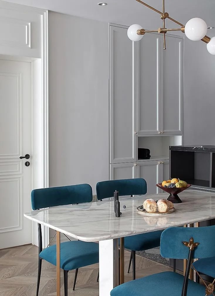 餐厅,大理石台面餐桌简约而高级,搭配孔雀蓝餐椅复古范十足,和细线条金属结合凸显精致感。