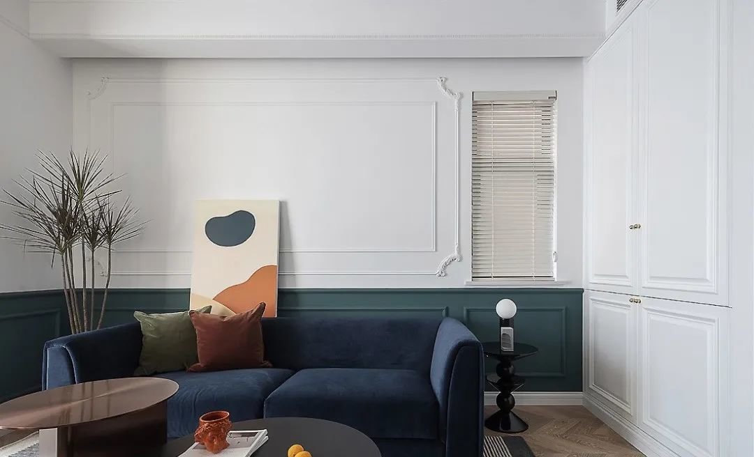 沙发背景墙采用拼色墙面和石膏线条搭配,墨绿色半墙有存在感但又不抢眼。右侧设置白色嵌入式柜体,超高颜值的隐形柜门,使空间达到美观和统一。