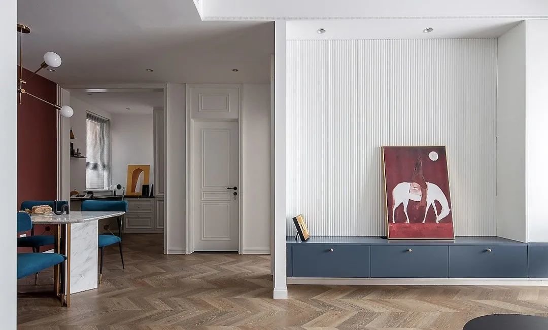 地面采用鱼骨拼地板铺贴,没有明显划分,视觉上空间十分协调。