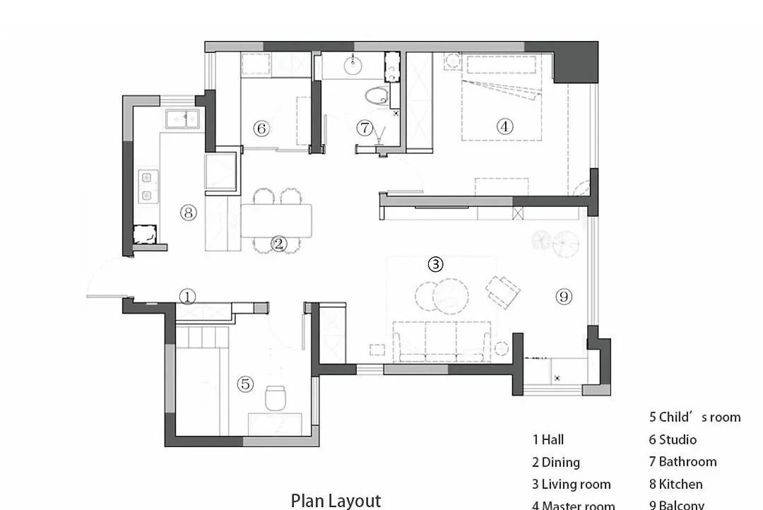 黑色桌面沿墙面设计,为书柜和抽屉节省空间,满足了办公+阅读的主要功能。