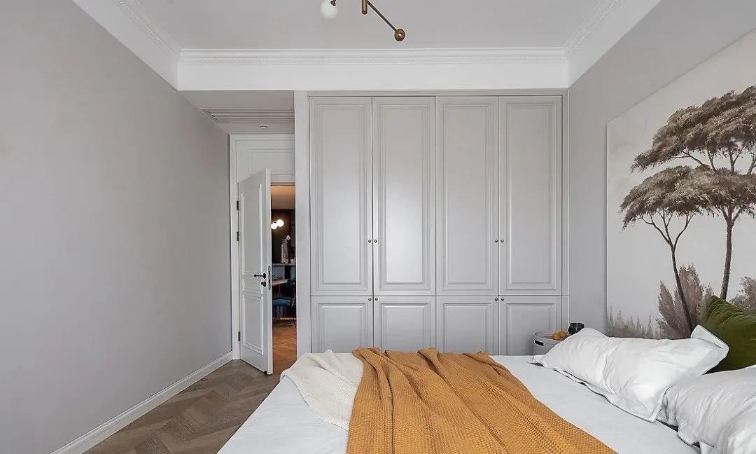 卧室的收纳通过整面顶高的衣柜来实现,浅灰色柜体和墙面毫不违和,整个空间色调十分和谐,令人倍感舒适。