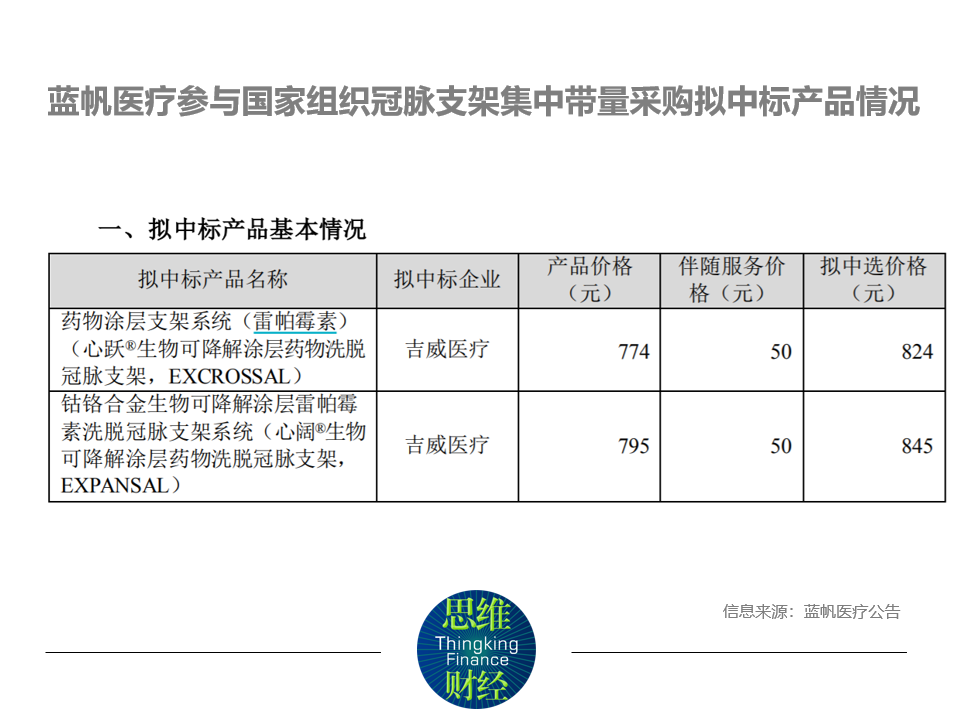 吉威医疗拟中标的两款产品分别为:药物涂层支架系统、钴铬合金生物可降解涂层西罗莫司(雷帕霉素)洗脱冠脉支架系统,产品价格分别为774元/条、795元/条,加上伴随服务价格50元/条,拟中标价格分别为824元/条、845元/条。