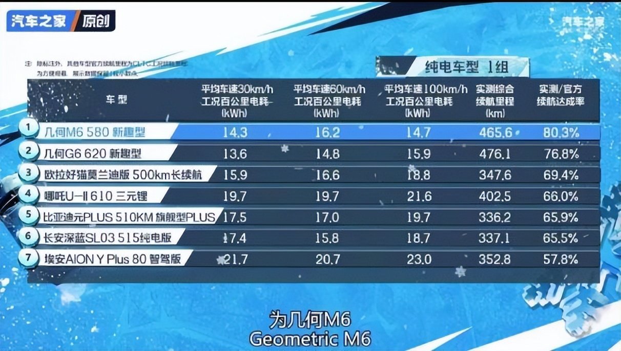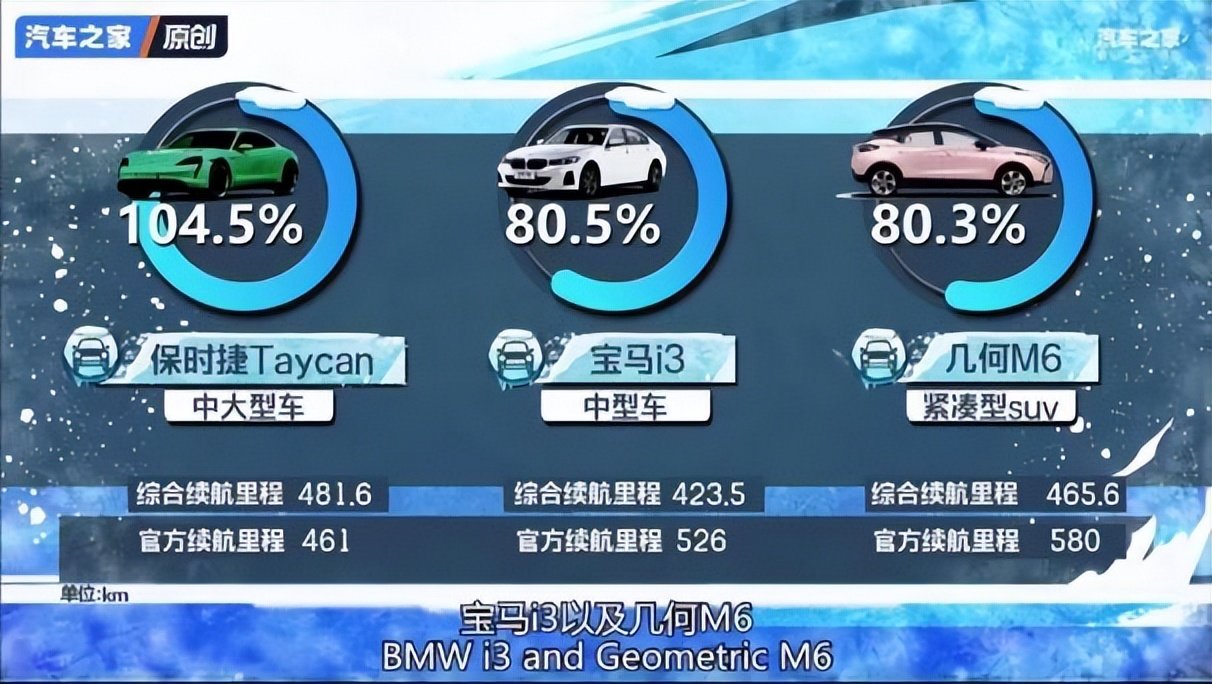 在本次测试中,几何汽车的表现尤为亮眼。在总榜单中,几何M6以80.3%的续航达成率,与保时捷、宝马两个豪华品牌共同跻身冬测榜TOP3。在20万以下组别续航测试中,几何G6/M6的续航达成率排名前2,以绝对领先的成绩,“称霸”冬季续航挑战赛。