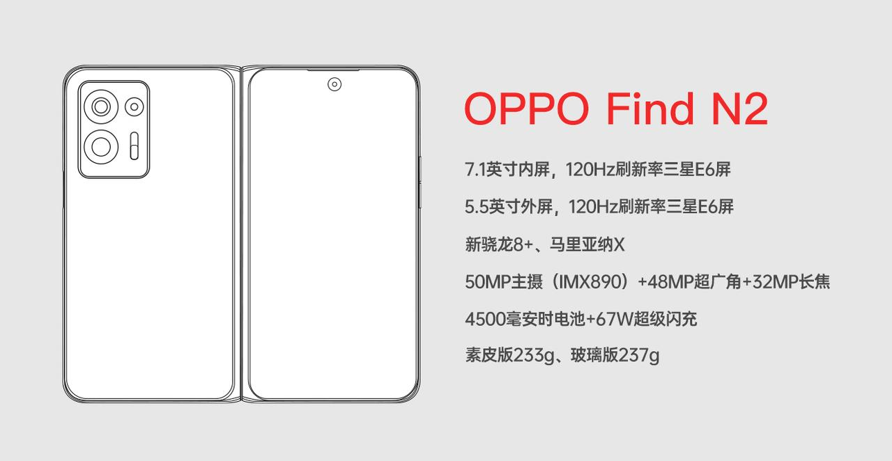 3、OPPO Find N2,这款要等到12月15号发布,很快了。看官宣也是主打轻巧设计,爆料的亮点有这些: ①全新升级的超轻固精工拟椎式铰链,更加坚固、占用空间更少;②后置5000万像素主摄,IMX890传感器,预计会支持OIS光学防抖;③ 据说内屏7.1英寸,内外屏都有120Hz高刷,屏幕采用三星E6材质;④有素皮和玻璃两种后盖材质,机身重量在230g左右,放在折叠屏中算十分轻的了。