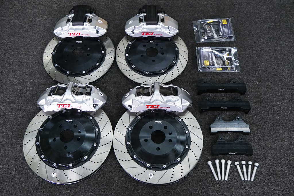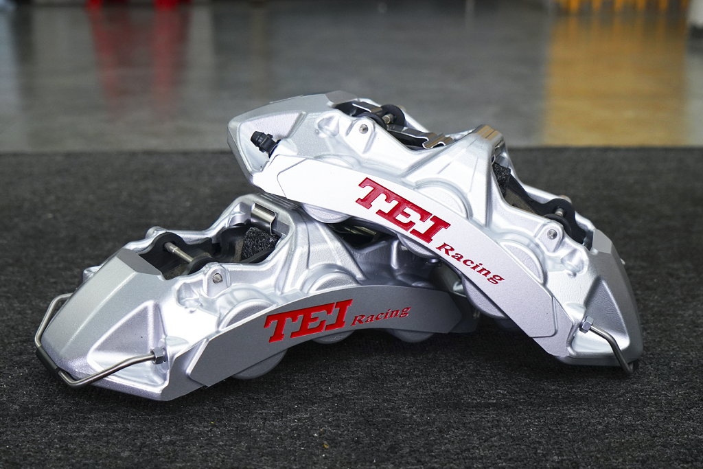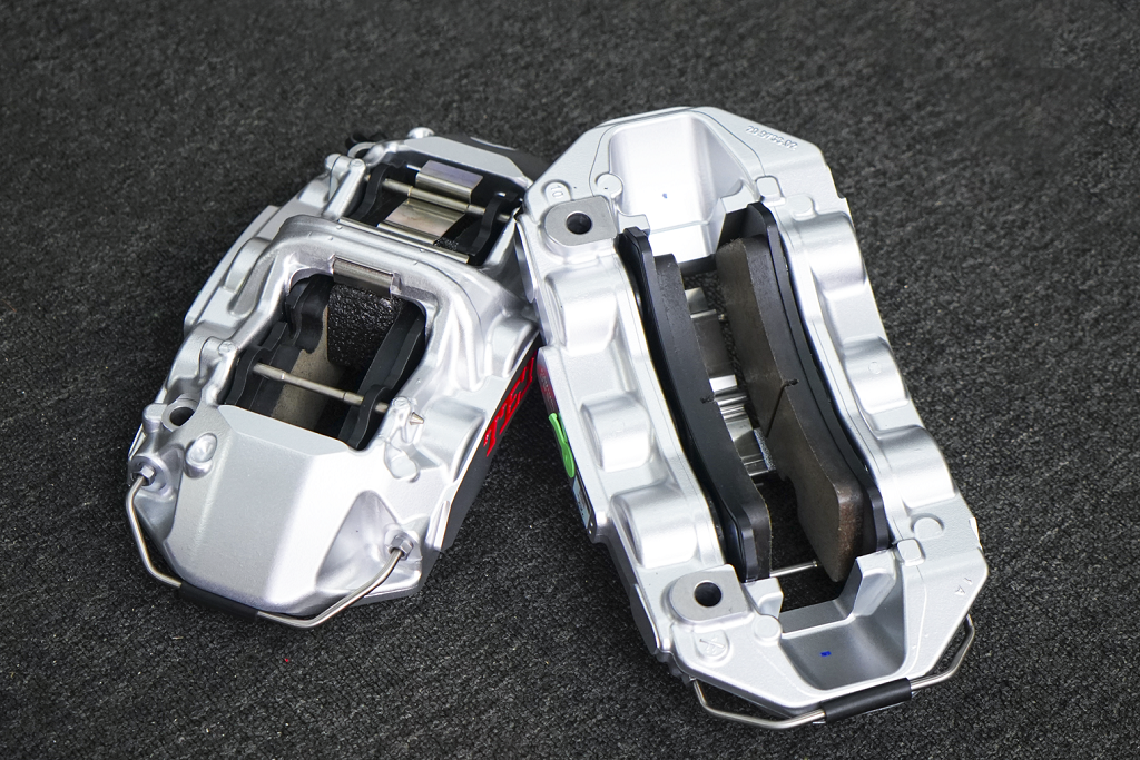 前轮装S60是一款街道版高性能刹车套件,采用航空铝合金一体式六活塞卡钳;不等径多活塞轻量化设计,可以让刹车脚感更线性,低速时轻踩刹车不会有那种撞墙的感觉,同时提升舒适度。