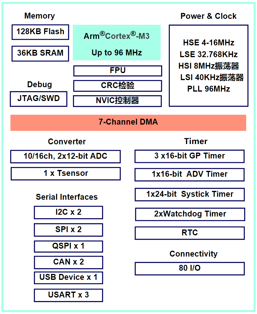 片上资源丰富,以标准功能、高可靠性能为用户应用场景带来更适配的选择;同时内置专用于浮点运算的FPU协处理单元,挂在AHB总线上,能够快速处理较为复杂的浮点运算,例如扫描枪的解码算法、PID算法、快速傅里叶变换等,加快系统处理能力。