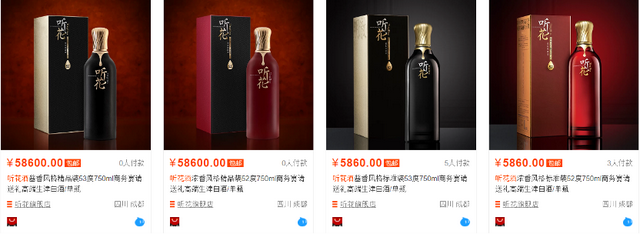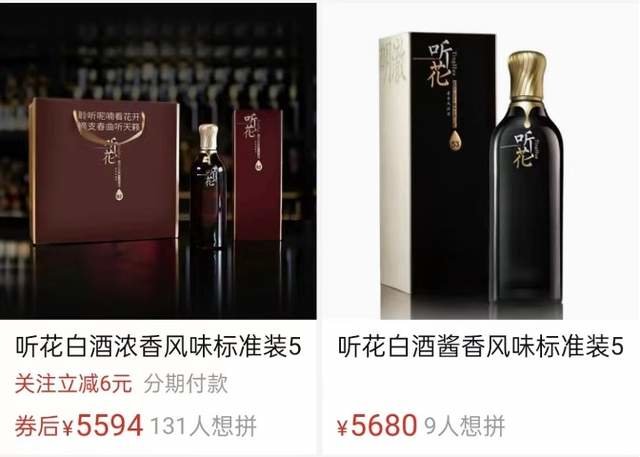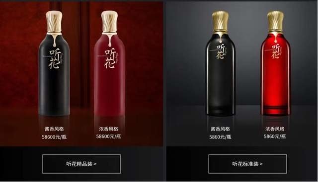 具体到产品方面,在听花酒系列仅挂出四款酒,分别是浓香标准装52度750ml、酱香标准装53度750ml、酱香精品装53度750ml、浓香精品装53度750ml。