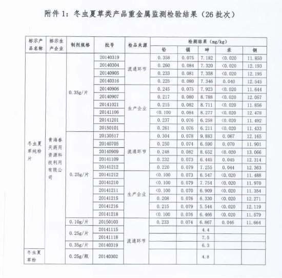 大望财讯发现,食药监总局对26批次青海春天冬虫夏草产品进行了重金属检测检验,这26批次产品中除一个批次为冬虫夏草粉以外,其余的均为冬虫夏草纯粉片。其砷检测结果最高的为9.883mg/kg,最低也是4.4mg/kg。这一结果与药监局之前发布的消费提示完全吻合。而这一检测结果远超保健食品1.0mg/kg的安全标准砷限量值。