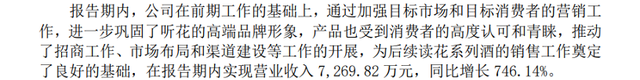 在今年上半年,酒水板块以听花酒为代表,在2022年上半年实现营收7269.82万元,同比剧增746.14%。酒水板块的收入占到了全部营收约70%。
