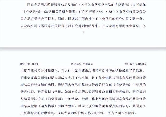 值得注意的是,青海春天却反过来接连叫板监管部门。2016年2月15日,青海春天发布公告“理直气壮”地称:国家药监局发布的消费提示“缺乏相关的研判依据,存在不严谨之处,对整个冬虫夏草行业及我公司产品声誉造成了损害”。